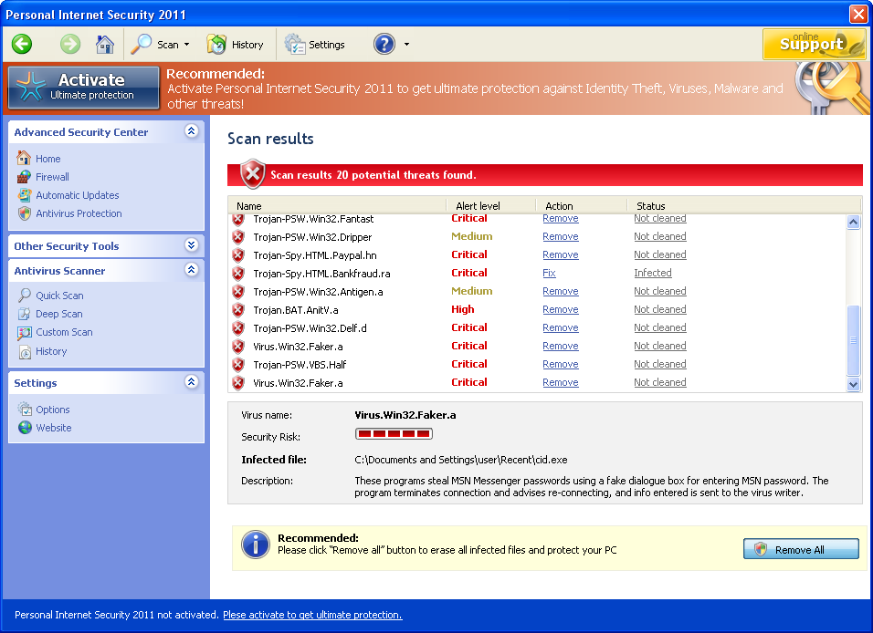Total security 2009, System Security rogue. This fake anti-spyware tool displays fake alert messages, prevent execution of legit programs, detects inexistent infections and Hijacks desktop background to scare users.